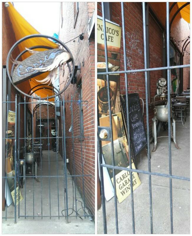 A group of friends and I were exploring Pittsburgh’s Historic Strip District when I came across this quaint hole in the wall alleyway. I combined two photos into one per Android’s collage feature so I could capture every detail. The Strip District is what the kids nowadays call.. Hipster. It’s an eclectic urban street market sprinkled with multicultural influences. I immediately felt the flower power as I stepped into this peaceful realm. Each stop seemed to be some type of organic business: mom and pop shop restaurants, fresh from the farm produce stands, hand-stitched clothing stores (I saw a pair of slippers made from alpaca fleece), homemade soaps and candles, used bookstores, etc. This alley gate has “Enrico” advertised on it which is an entrance and/or exit of an Italian cafe named The Enrico Biscotti Company. Immediately, I could tell this was a functional passageway because of how clean it was with the aligned tables and chairs under the brightly colored canopy, the string of lights, the stacks of signs, the brick wall scribbles in either chalk or spray paint, and a vintage freestanding mixer.